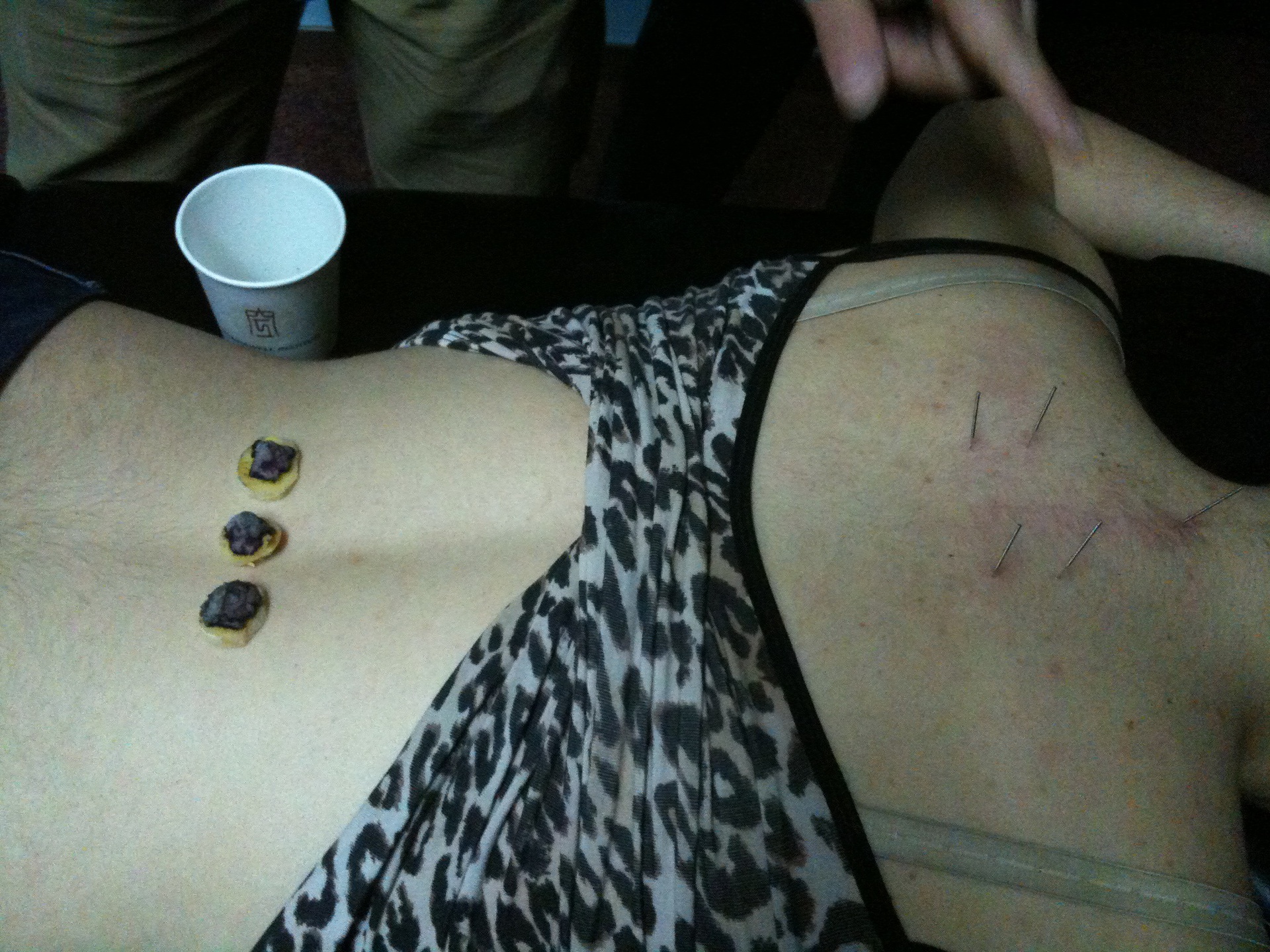 Это прижигание мокса: сначала кладем соль, потом кусочек имбиря, а сверху полынный конус и поджигаем